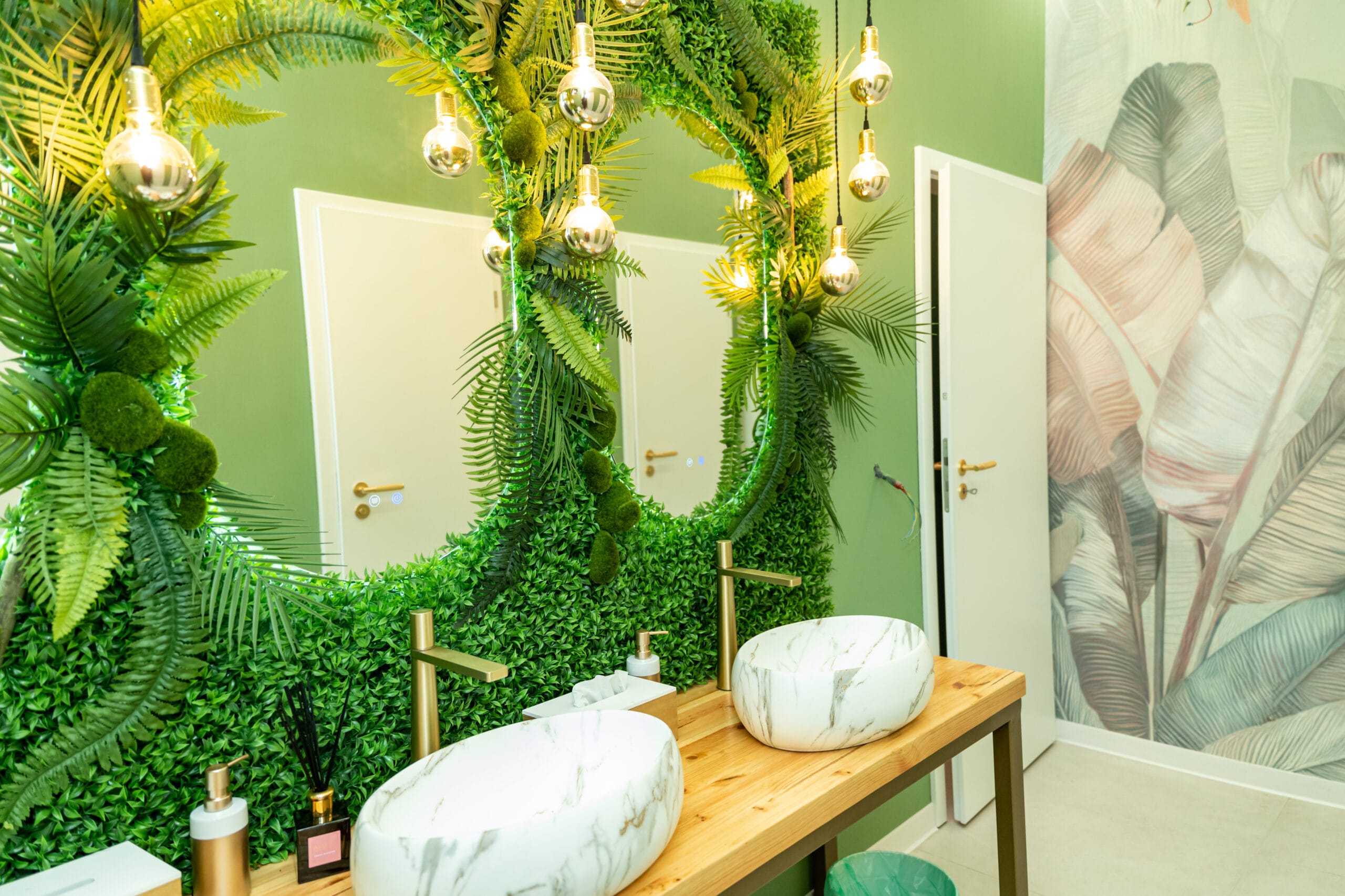 La Lotus by the Lake, zona de prezidiu este mai mult decât o simplă masă centrală. În spatele ei, tronează un panou decorativ plin de textură și verdeață, completat de logo-ul nostru luminos. Un punct de atracție vizuală ideal pentru fotografii memorabile.
